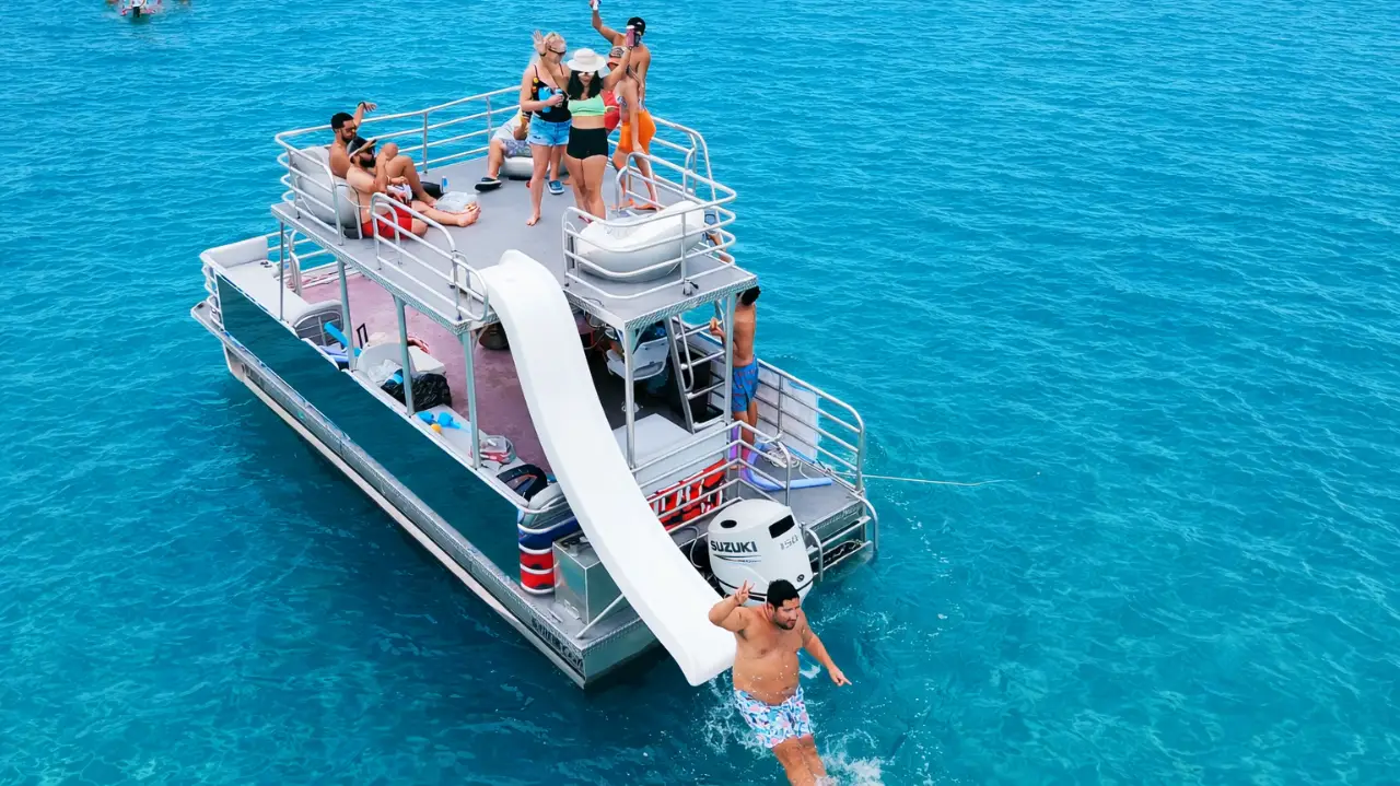 Commercial grade double decker pontoon, featuring a 10ft deck. With plenty of seating. Boat features a secondary deck with a water slide. Boat comes with games and great music. Party Boat is BYOB. You bring the booze, we keep it cold all day. Games provided: Beer Pong, Bottle Frisbee, Basketball, Volleyball, Football, Boat is a double decker with 1 slide, etc. You're free to lounge on the sundeck or cool off in the water and mingle with the locals.