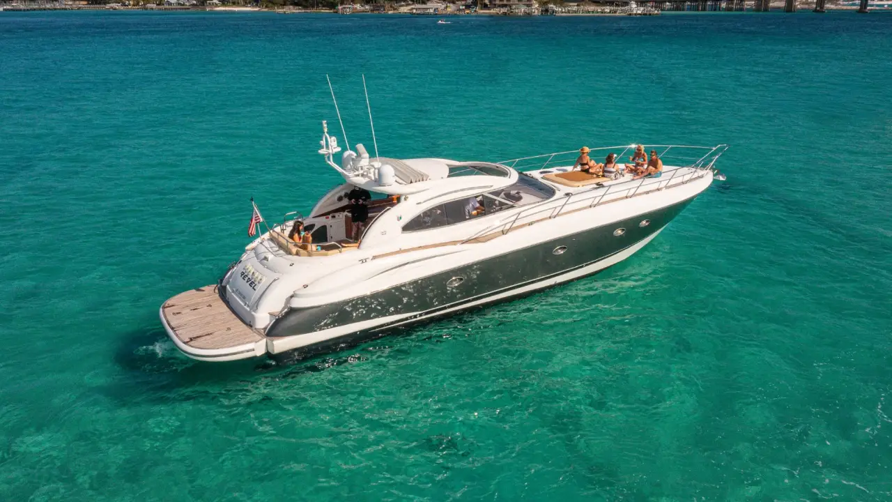 Enjoy a day out with friends and family. Cruising through the crystal clear waters of the beautiful Emerald Coast. Take a sunset cruise through the harbor or spend the day at Crab Island. Our Sunseeker 56' offers plenty of room for 12 occupants along with a Captain & First Mate to assist you. We have many options for whatever type of cruise you seek. Proposal, anniversary, wedding, birthday or maybe a bachelorette trip. The luxurious features of the Sunseeker do not disappoint with flat screen smart tvs in every room to cherry & teak finishes everywhere you look. You and your guests are sure to be comfortable while you cruise the emerald green waters of Destin. Listed below are just some of the features the Sunseeker has to offer.